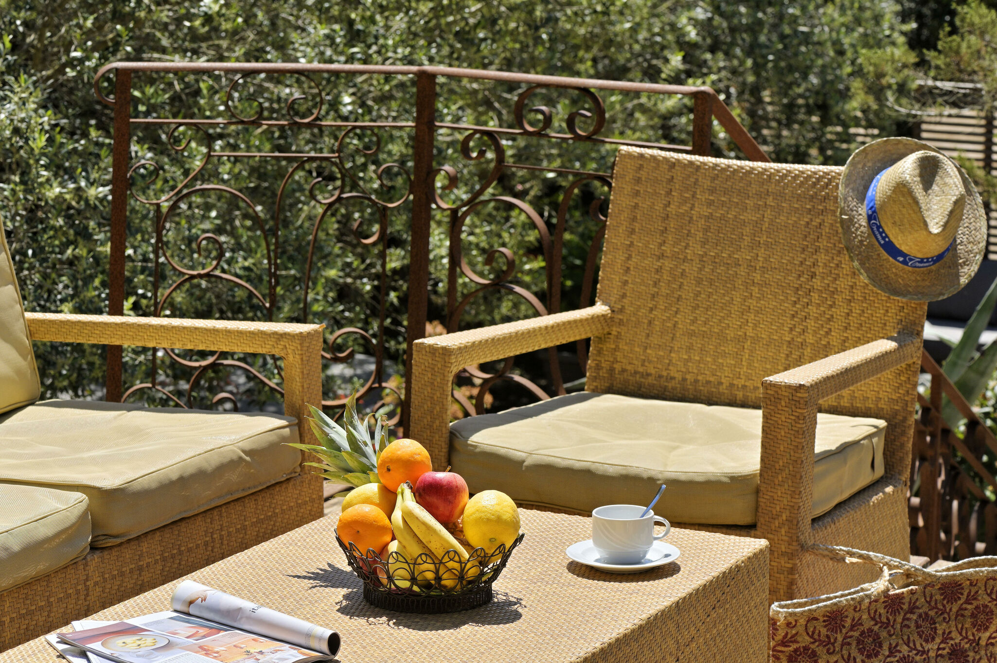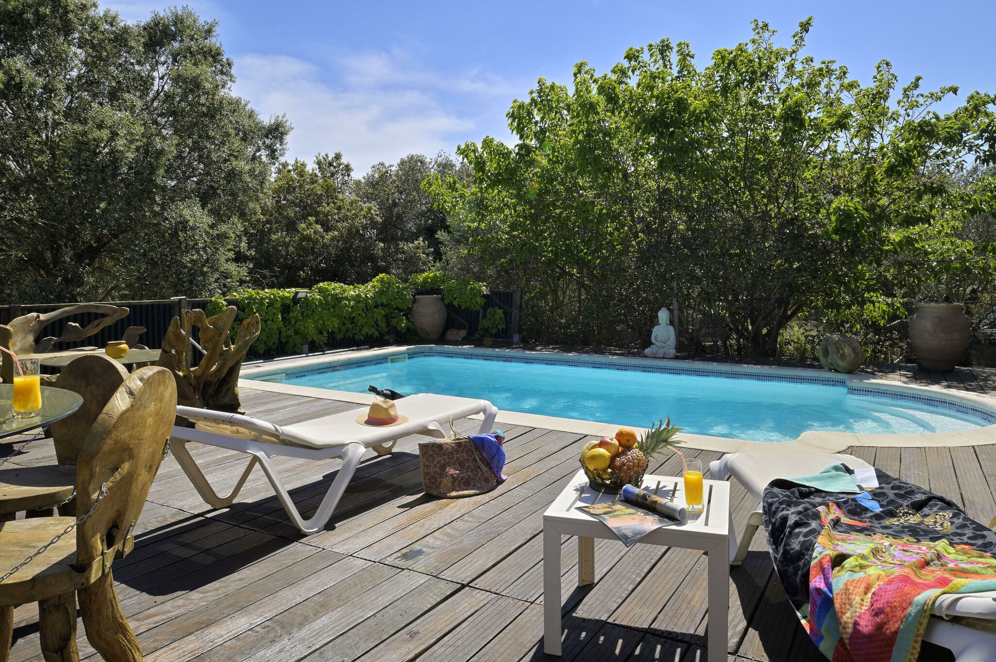 Une petite piscine cachée par les bougainvillées.